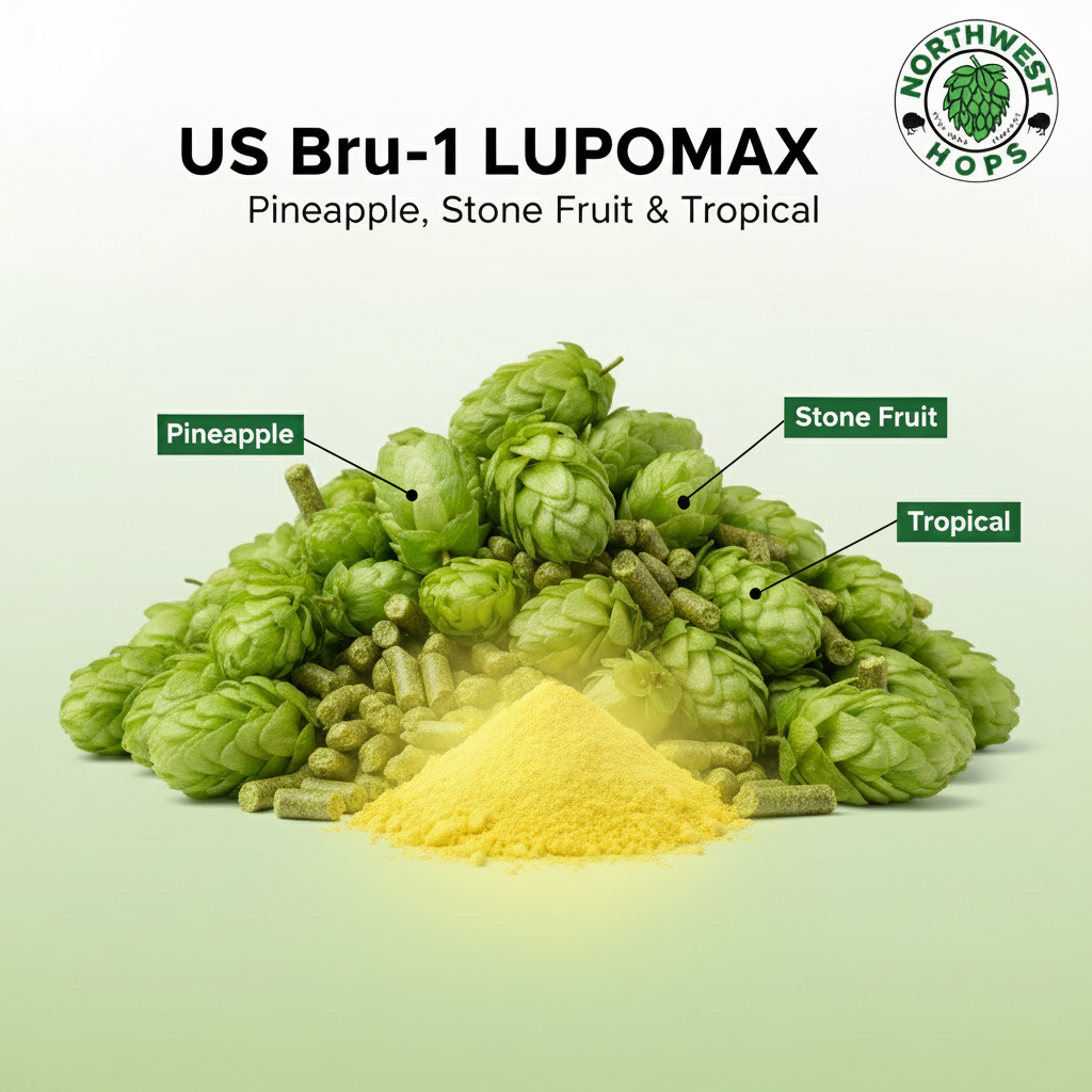 Bru-1 is known for its juicy pineapple, stone fruit and fresh citrus notes, with a subtle herbal edge. In LUPOMAX™ form, those traits are amplified—expect saturated pineapple, tropical fruit, light melon and citrus zest that shine in hazy IPAs, pale ales and other hop‑forward styles.