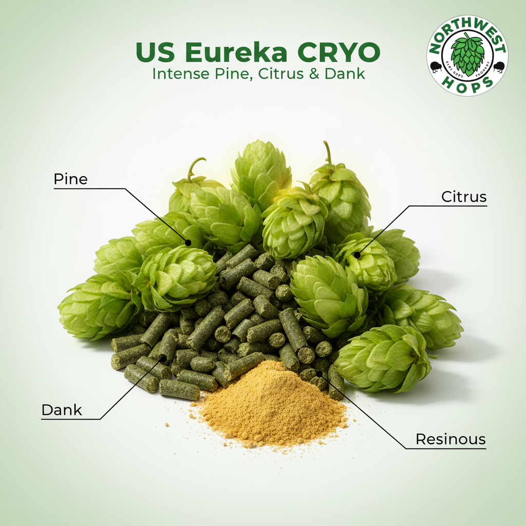 Eureka is known for its punchy mix of pine, resin, dark fruit, citrus and herbal notes—often described as “dank” and “in your face.” In CRYO® form, those traits are amplified. Expect saturated pine and resin, grapefruit zest, blackcurrant, dark berry and a firm, modern bitterness that shines in West Coast IPAs, double IPAs, black IPAs and hop‑forward strong ales.