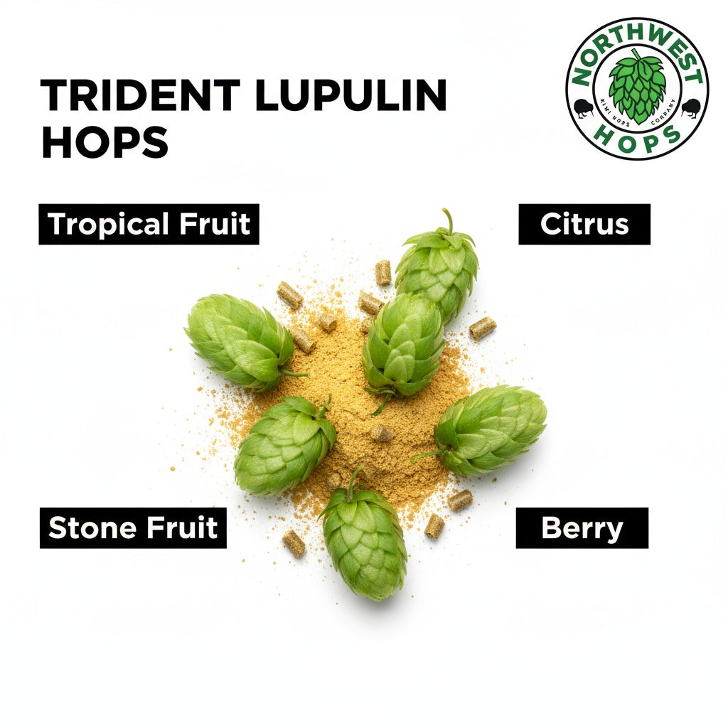 Trident Lupulin hops bring a wave of tropical, citrus, and stone fruit flavors with a clean, bold aroma. The lupulin-enriched pellets deliver intense hop character and smooth bitterness—perfect for late additions and dry hopping. Designed for maximum impact in hazy IPAs, pale ales, and hop-forward lagers.